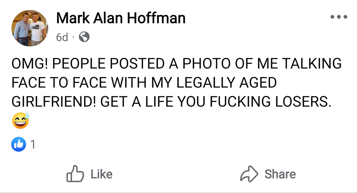 Since this whole fight debacle was brought to the public eye, Mark has started publicly admitting that he’s in a relationship with a young woman. Even ignoring the dubious past and only looking at his present relationship with a teenager, bear in mind that Mark is in his fifties. As with most of this document, this is not a legal judgment, but instead a moral one.