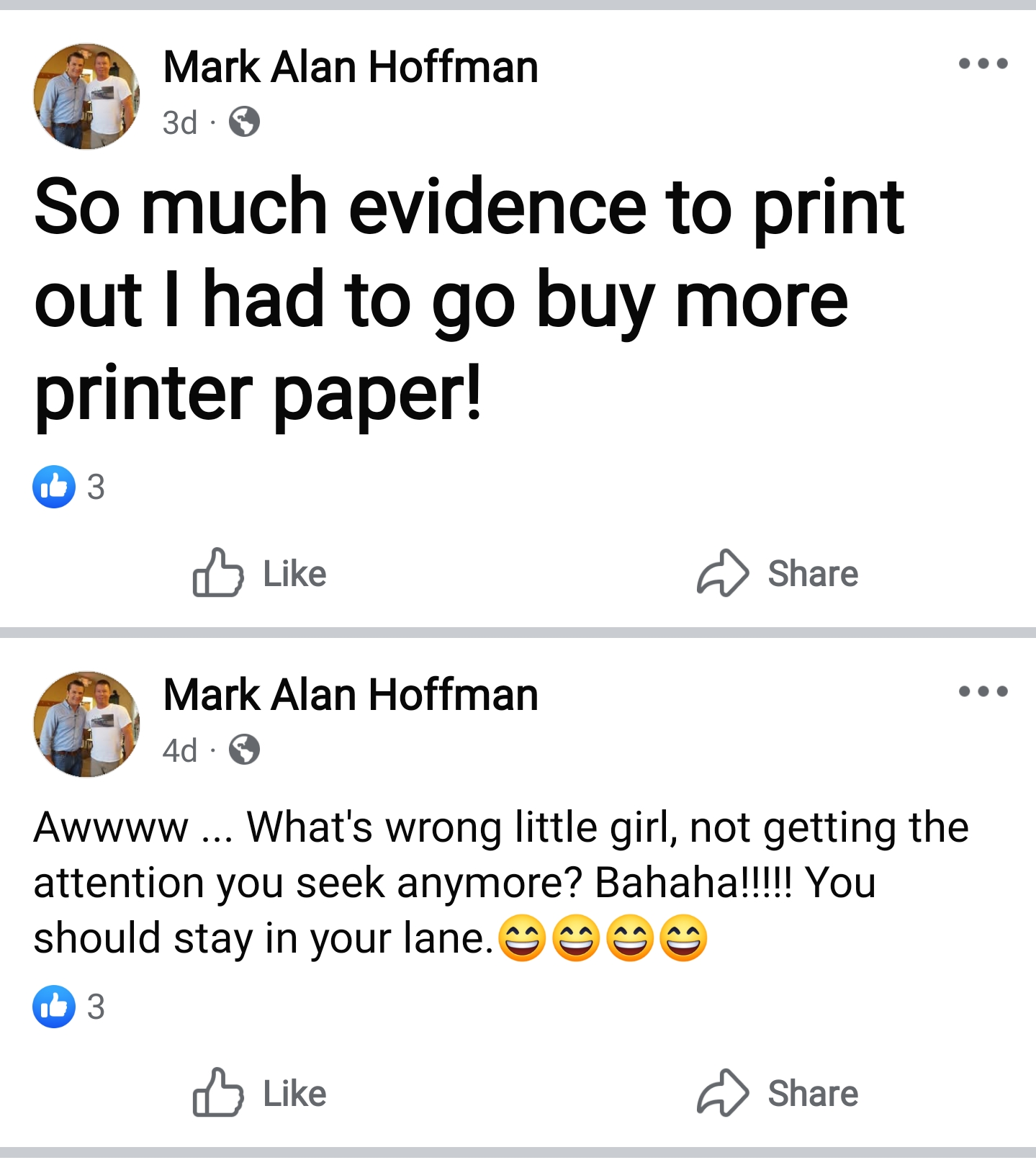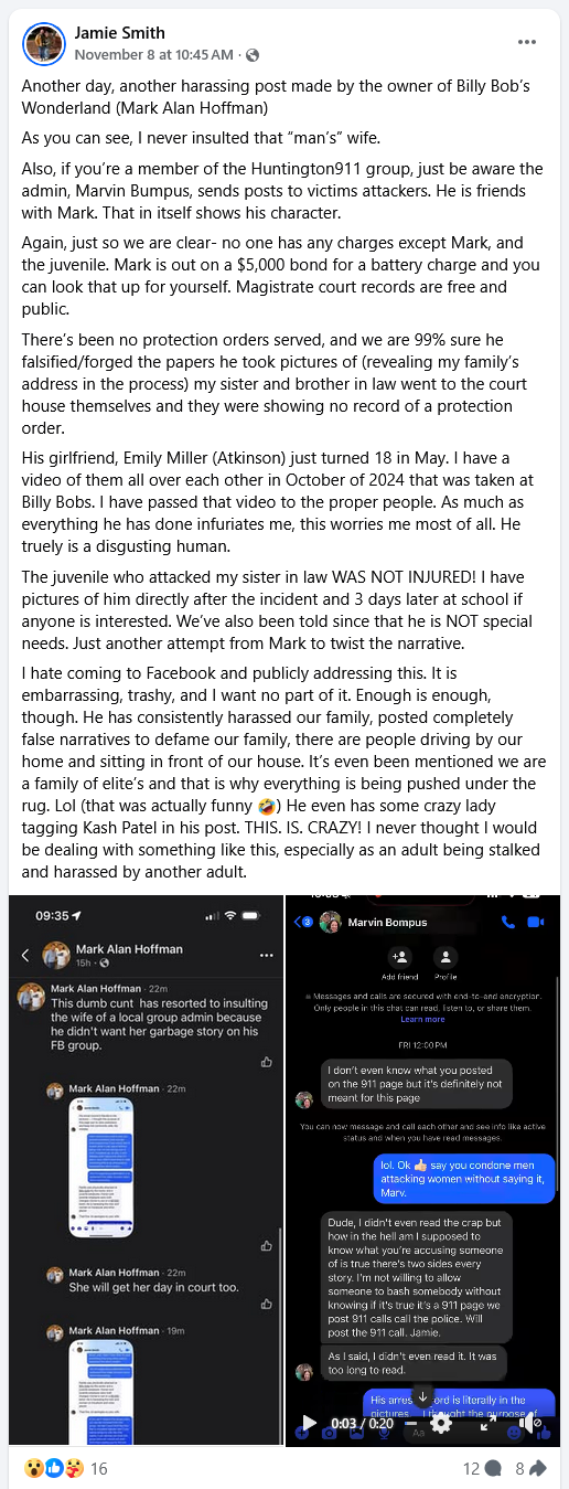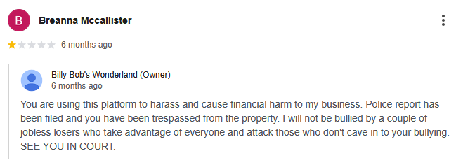 Another day, another harassing post made by the owner of Billy Bob’s Wonderland (Mark Alan Hoffman)