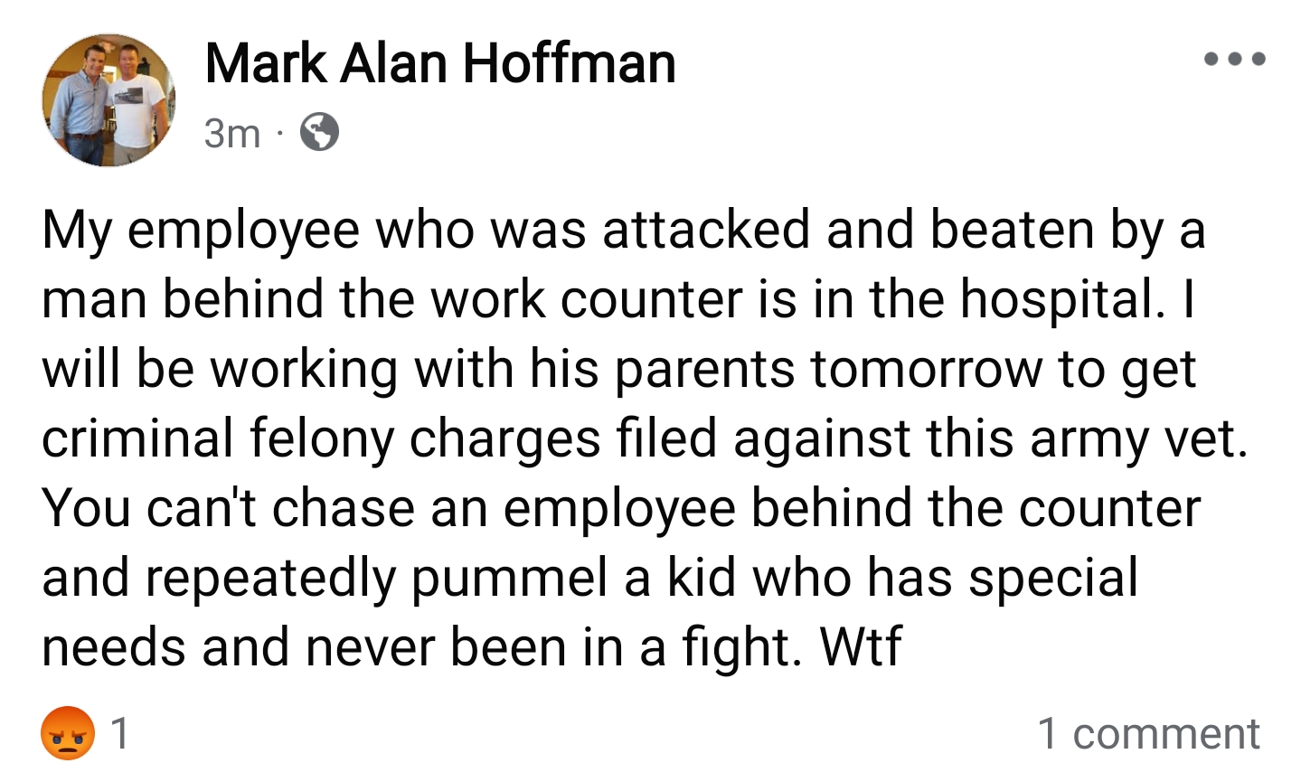 Around the same time, presumably shortly after the previous post, Mark posted this account of the incident, in which—opposite to Ms. Smith’s claim—he alleged a military veteran assaulted one of his employees, physically unprovoked: