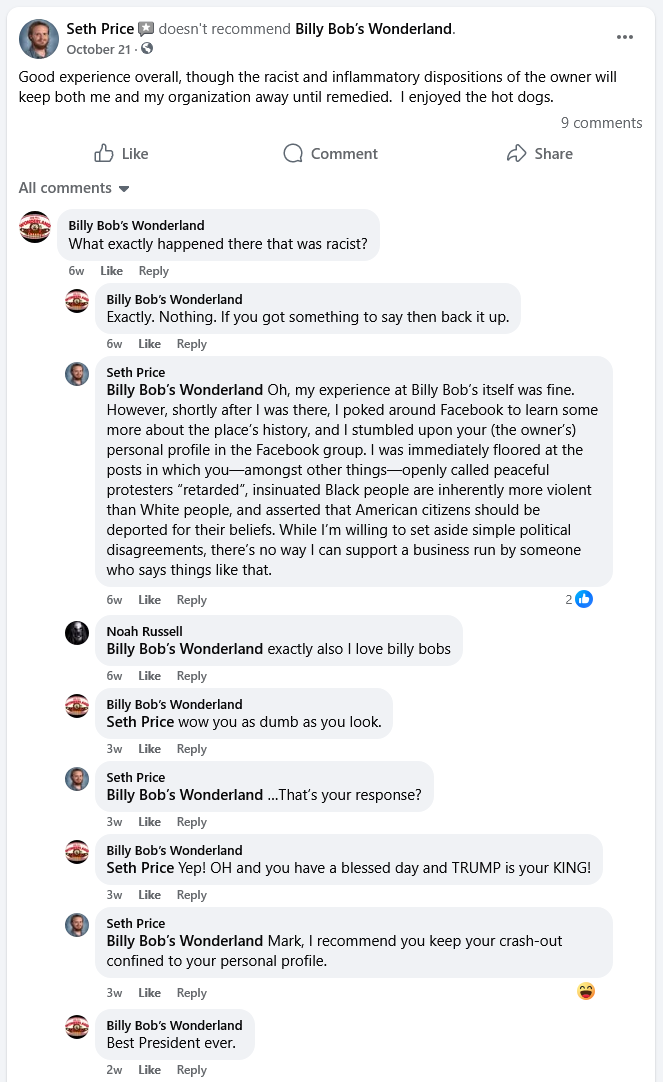 I realized he’d been posting through the Billy Bob’s page once I’d left a personal review on Facebook, after which he responded through the company page with mediocre, personal attacks and non-sequitirs about worshipping Trump.